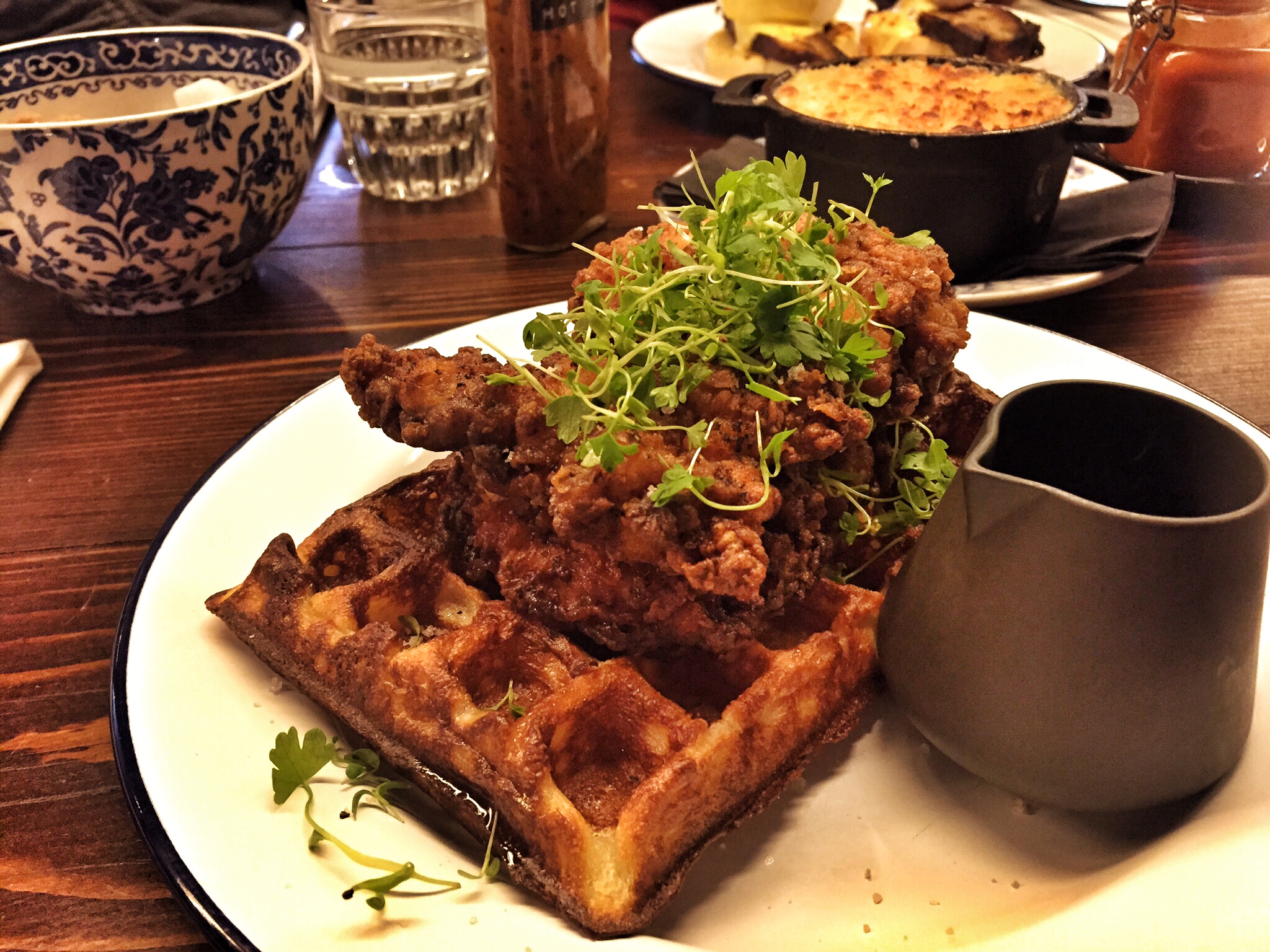 After speaking to the incredible waiter (curly haired, young with a mustache) I was encouraged to try the Chicken thighs and Waffles as apparently only that morning had the head chef perfected the waffle recipe to complement the chicken to perfection and well I had to be part of this famous moment. I must admit that I was scared of trying this dish as in my head the combination just doesn’t work. However, when the dish was served I was so glad that I had picked this beauty. Crispy fried chicken with the most buttery and fluffy waffle. You didn’t really get much sweetness from the waffle so it was almost like a bun for the juicy and spicy chicken thighs, in my mouth it felt like I was eating a chicken burger. I was not at all tempted to smothering my chicken with maple syrup as my brain couldn’t handle the idea but I tried it with just the waffle and it was heavenly. Dipping out of sweet and savoury just felt like a dream and a sin.